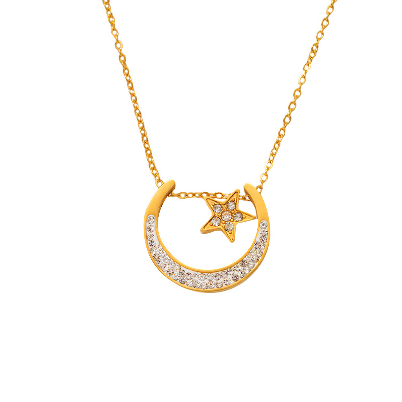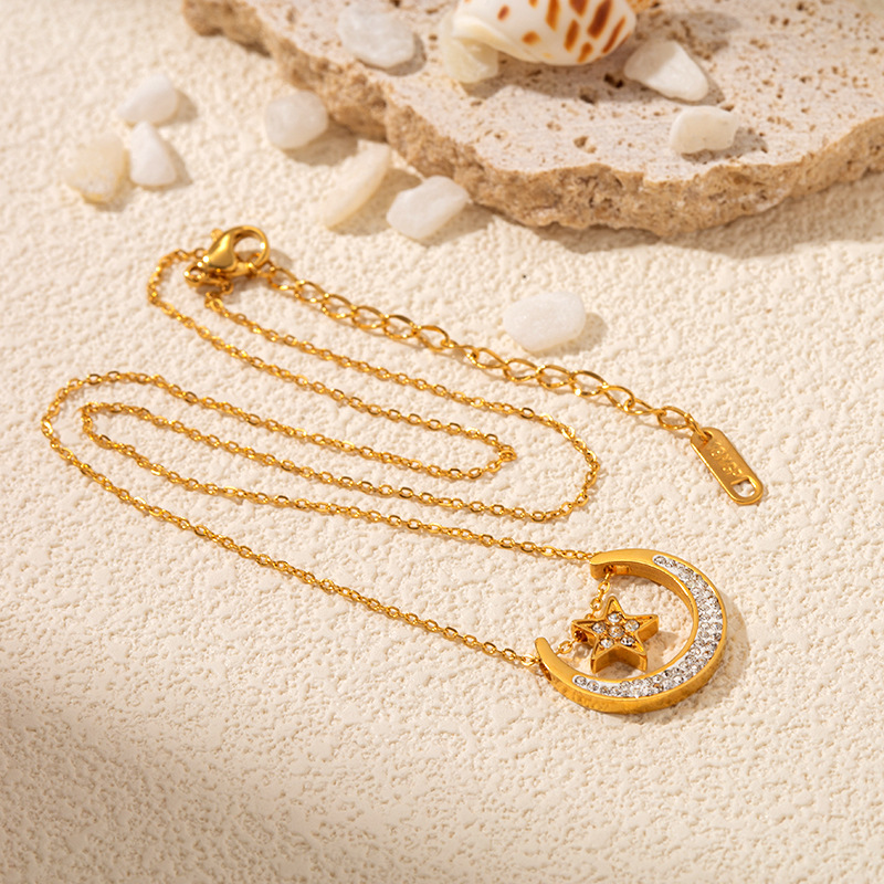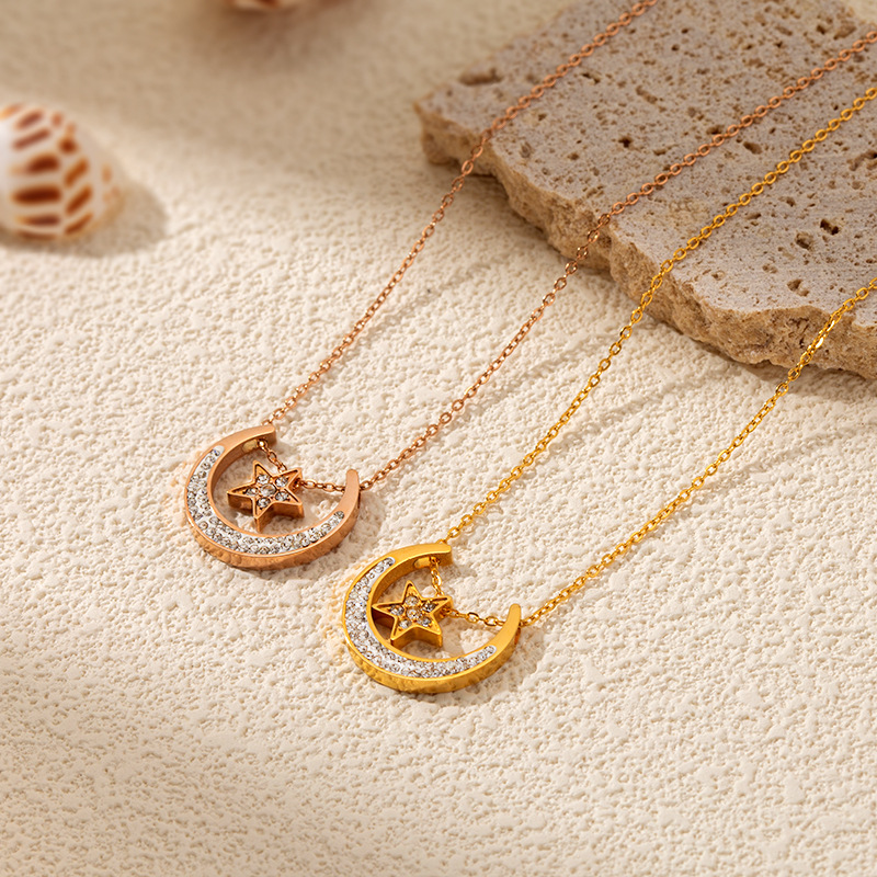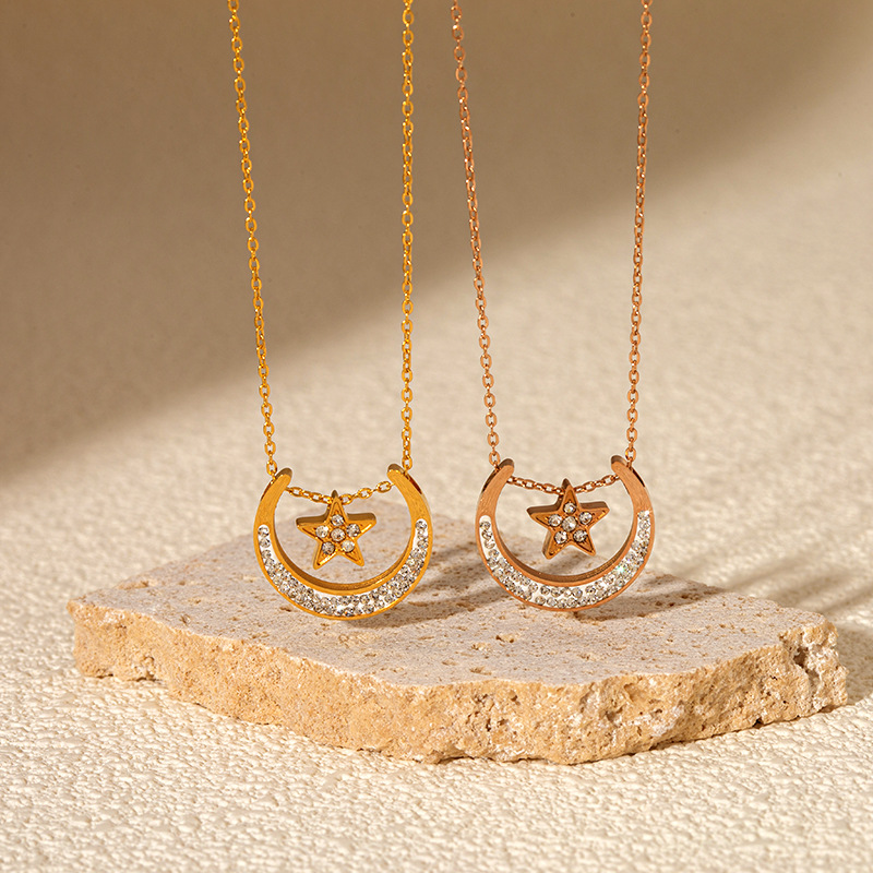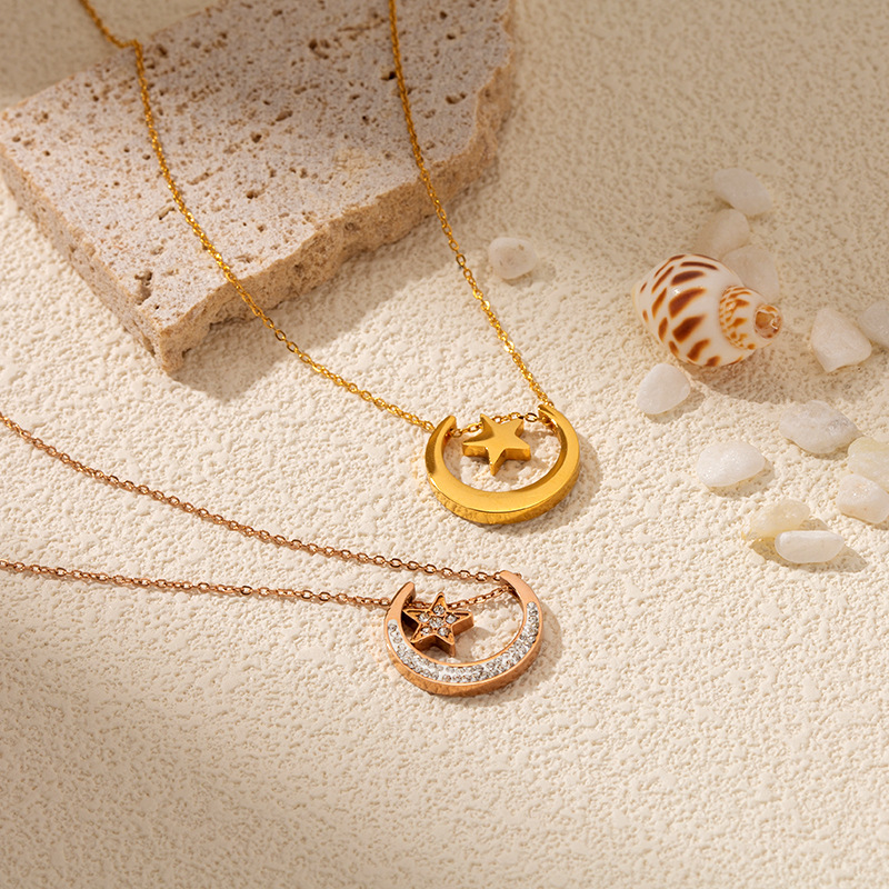 夏季海边项饰披星戴月项链时尚个性轻奢高级感锁骨链批发材质 处理工艺 品牌 造型 产地 链子样式 是否多层 主要下游平台 颜色 有可授权的自有品牌 是否跨境出口专供货源 流行元素 上市年份/季节 风格 风格分类 主要销售地区 适用人群 流行元素分类