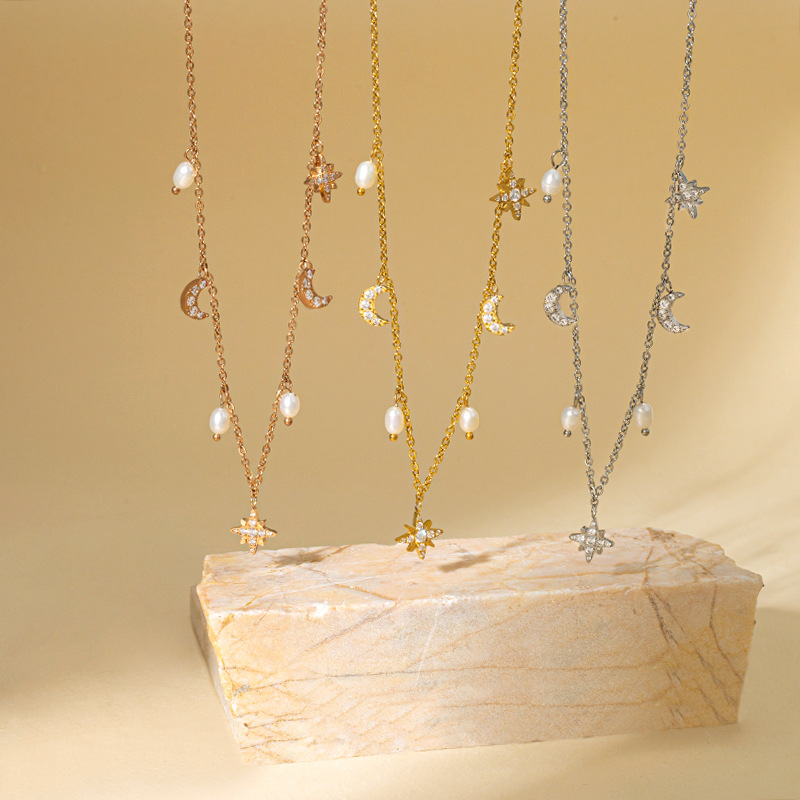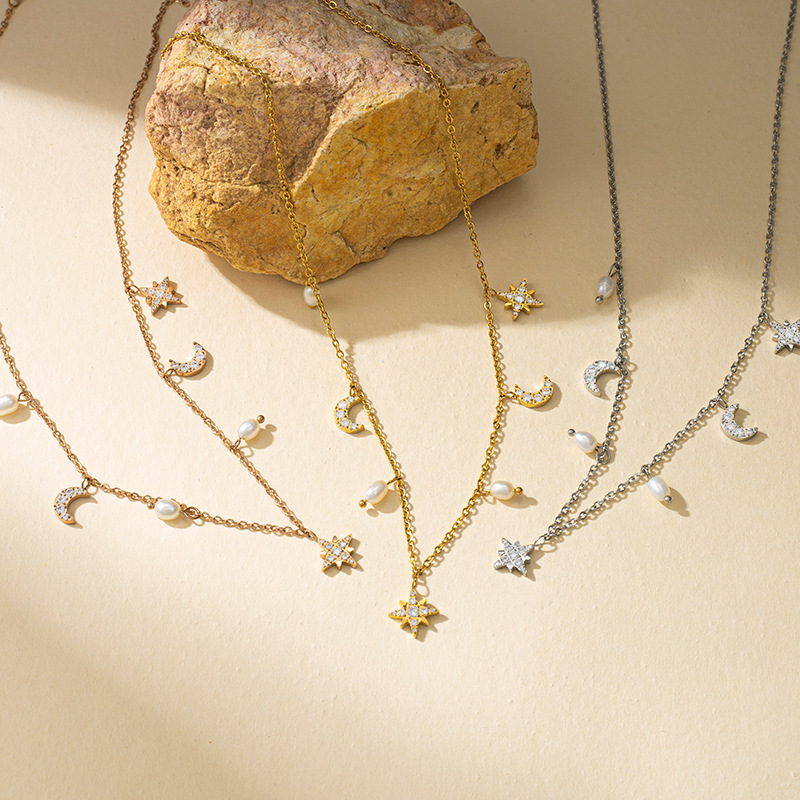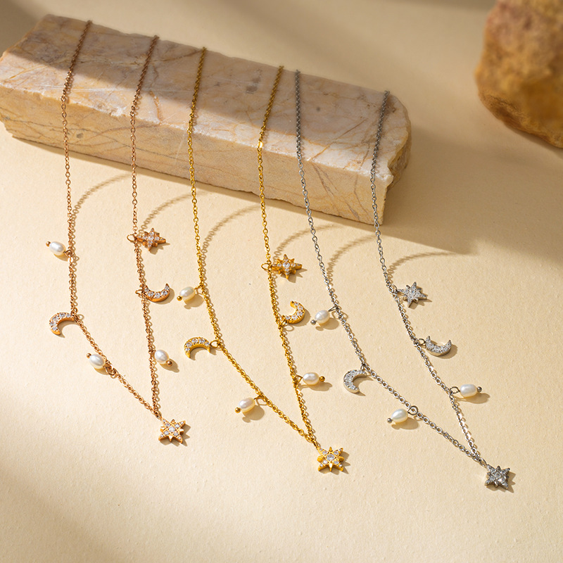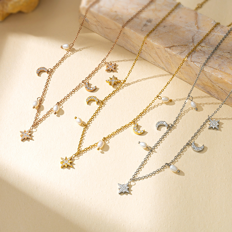 时尚优美金满天星项链钛钢微镶锆石项链亚马逊爆款跨境热星月材质 处理工艺 品牌 造型 产地 链子样式 是否多层 主要下游平台 颜色 有可授权的自有品牌 是否跨境出口专供货源 流行元素 上市年份/季节 风格 风格分类 主要销售地区 适用人群 流行元素分类